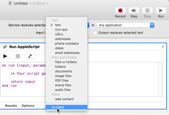 Then drag and drop "Run AppleScript" from the Utilities section: